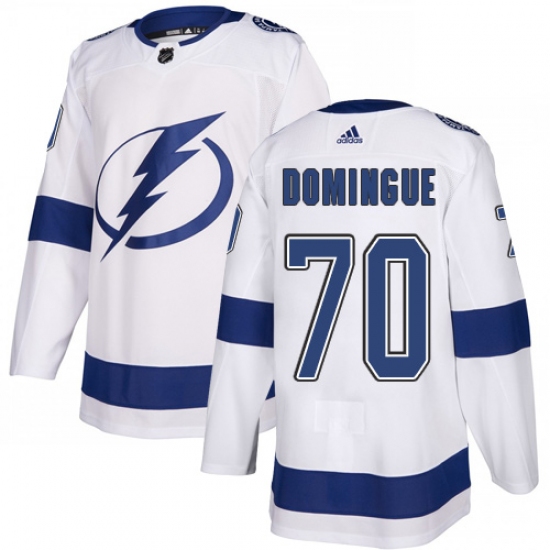 >Men's Adidas Tampa Bay Lightning #70 Louis Domingue Authentic White Away NHL Jersey