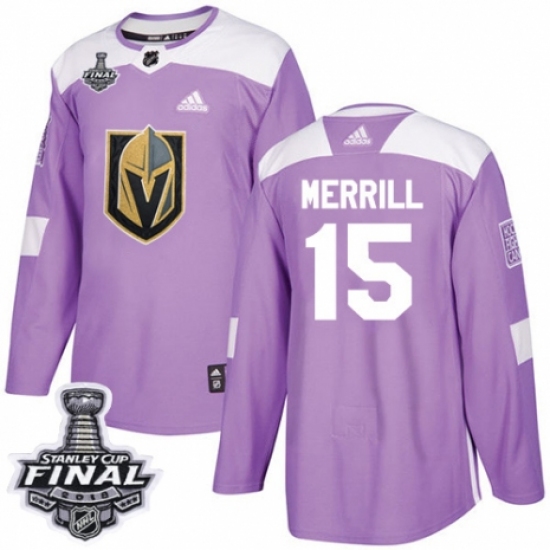 >Men's Adidas Vegas Golden Knights #15 Jon Merrill Authentic Purple Fights Cancer Practice 2018 Stanley Cup Final NHL Jersey