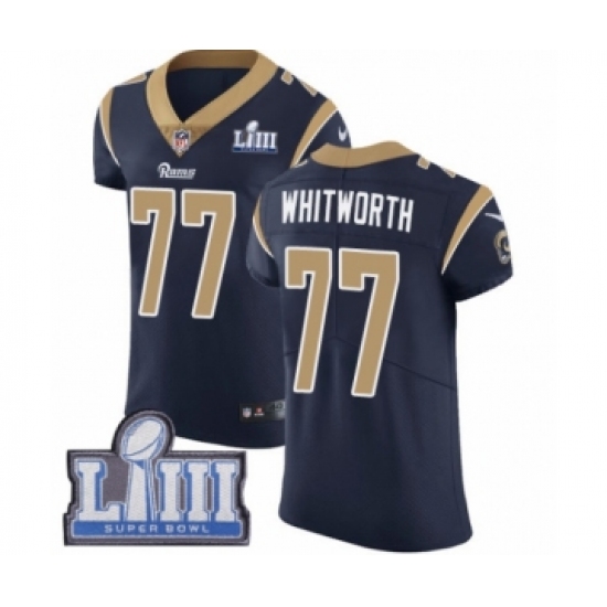 >Men's Nike Los Angeles Rams #77 Andrew Whitworth Navy Blue Team Color Vapor Untouchable Elite Player Super Bowl LIII Bound NFL Jersey
