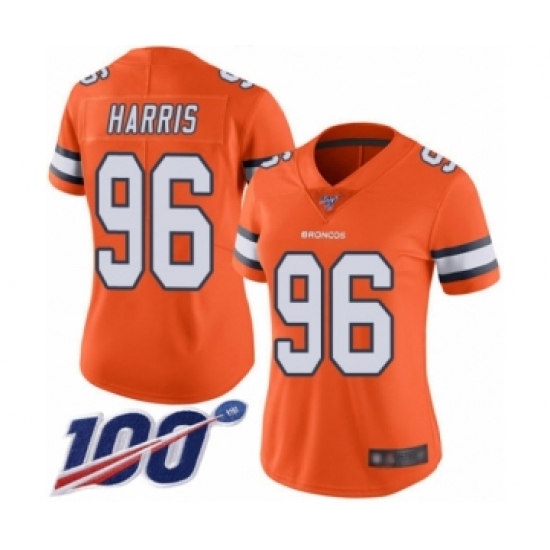 >Women's Denver Broncos #96 Shelby Harris Limited Orange Rush Vapor Untouchable 100th Season Football Jersey