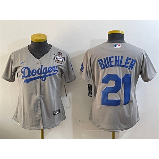 Women's Los Angeles Dodgers #21 Walker Buehler Grey 2024 World Series Cool Base Stitched Baseball Jersey(Run Small)