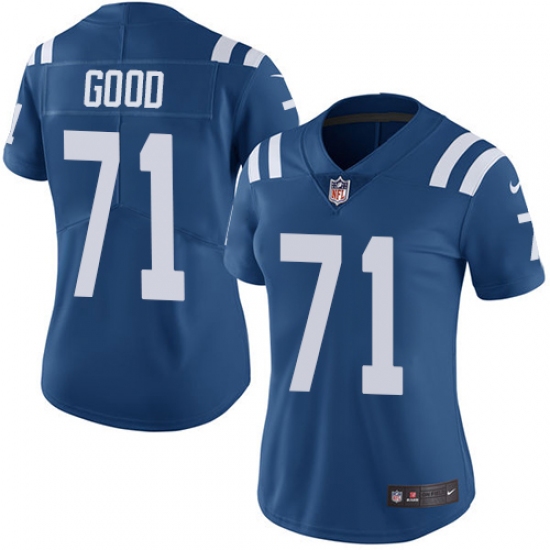 Home>NFL>Indianapolis Colts>Denzelle Good>Women's Nike Indianapolis Colts #71 Denzelle Good Royal Blue Team Color Vapor Untouchable Limited Player NFL Jersey