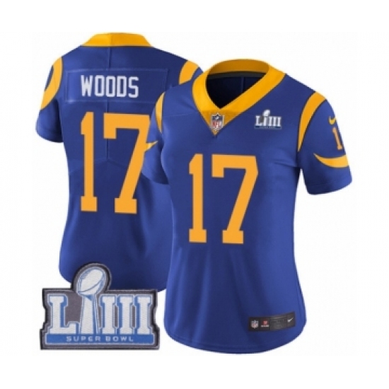 >Women's Nike Los Angeles Rams #17 Robert Woods Royal Blue Alternate Vapor Untouchable Limited Player Super Bowl LIII Bound NFL Jersey