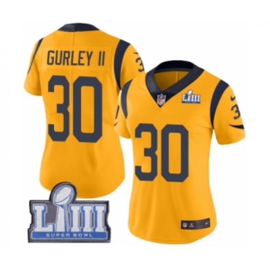 >Women's Nike Los Angeles Rams #30 Todd Gurley Limited Gold Rush Vapor Untouchable Super Bowl LIII Bound NFL Jersey