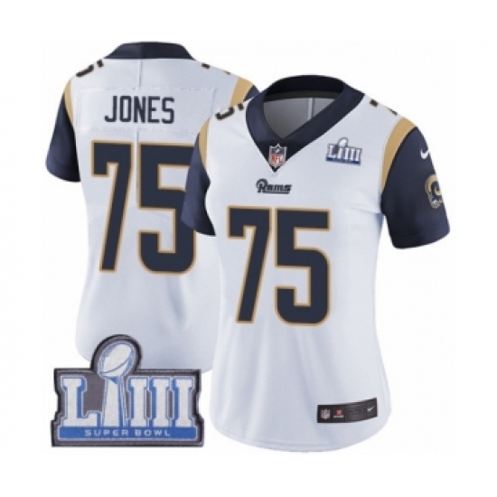 >Women's Nike Los Angeles Rams #75 Deacon Jones White Vapor Untouchable Limited Player Super Bowl LIII Bound NFL Jersey