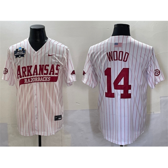 >Men's Arkansas Razorbacks #14 Gage Wood White Pinstripe 2025 World Series & SEC Patch Stitched Jersey