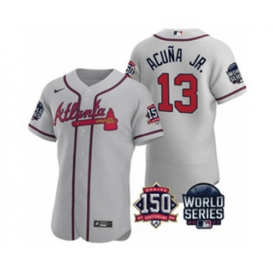 Men's Atlanta Braves #13 Ronald Acuna Jr. 2021 Gray World Series Flex Base With 150th Anniversary Patch Baseball Jersey