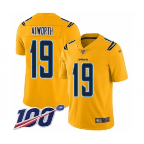 >Men's Los Angeles Chargers #19 Lance Alworth Limited Gold Inverted Legend 100th Season Football Jersey