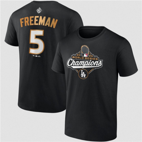 Men's Los Angeles Dodgers #5 Freddie Freeman Black 2025 World Series Champions Name & Number T-Shirt