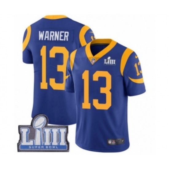 >Men's Nike Los Angeles Rams #13 Kurt Warner Royal Blue Alternate Vapor Untouchable Limited Player Super Bowl LIII Bound NFL Jersey