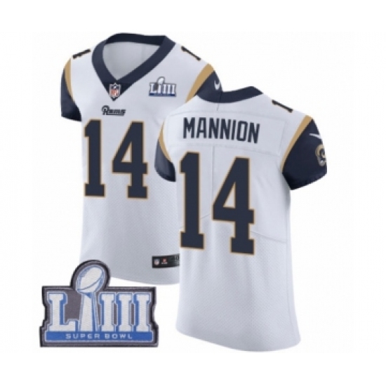 >Men's Nike Los Angeles Rams #14 Sean Mannion White Vapor Untouchable Elite Player Super Bowl LIII Bound NFL Jersey