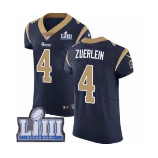 >Men's Nike Los Angeles Rams #4 Greg Zuerlein Navy Blue Team Color Vapor Untouchable Elite Player Super Bowl LIII Bound NFL Jersey