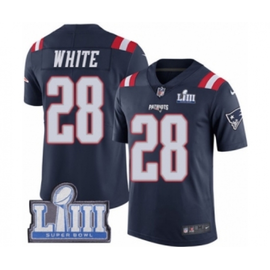 >Men's Nike New England Patriots #28 James White Limited Navy Blue Rush Vapor Untouchable Super Bowl LIII Bound NFL Jersey
