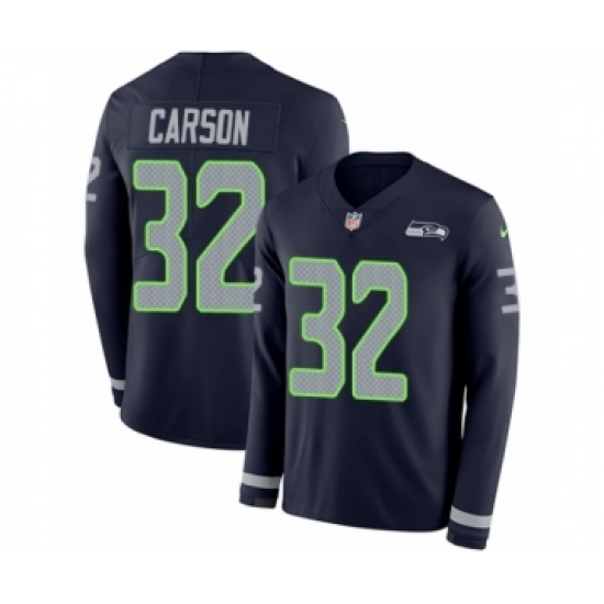 >Men's Nike Seattle Seahawks #32 Chris Carson Limited Navy Blue Therma Long Sleeve NFL Jersey