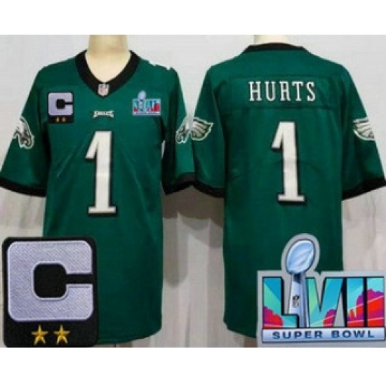 Men's Philadelphia Eagles #1 Jalen Hurts Green Super Bowl LVII Patch And 2-star C Patch Vapor Untouchable Limited Stitched Jersey