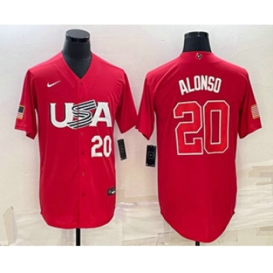 >Mens USA Baseball #20 Pete Alonso Number 2023 Red World Classic Stitched Jersey