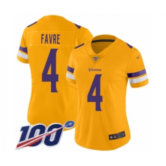 >Women's Minnesota Vikings #4 Brett Favre Limited Gold Inverted Legend 100th Season Football Jersey