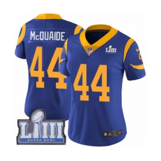 >Women's Nike Los Angeles Rams #44 Jacob McQuaide Royal Blue Alternate Vapor Untouchable Limited Player Super Bowl LIII Bound NFL Jersey