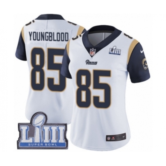 >Women's Nike Los Angeles Rams #85 Jack Youngblood White Vapor Untouchable Limited Player Super Bowl LIII Bound NFL Jersey