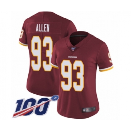 >Women's Washington Redskins #93 Jonathan Allen Burgundy Red Team Color Vapor Untouchable Limited Player 100th Season Football Jersey