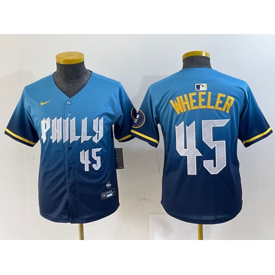 >Youth Philadelphia Phillies #45 Zack Wheeler Blue 2024 City Player Number Cool Base Stitched Jersey